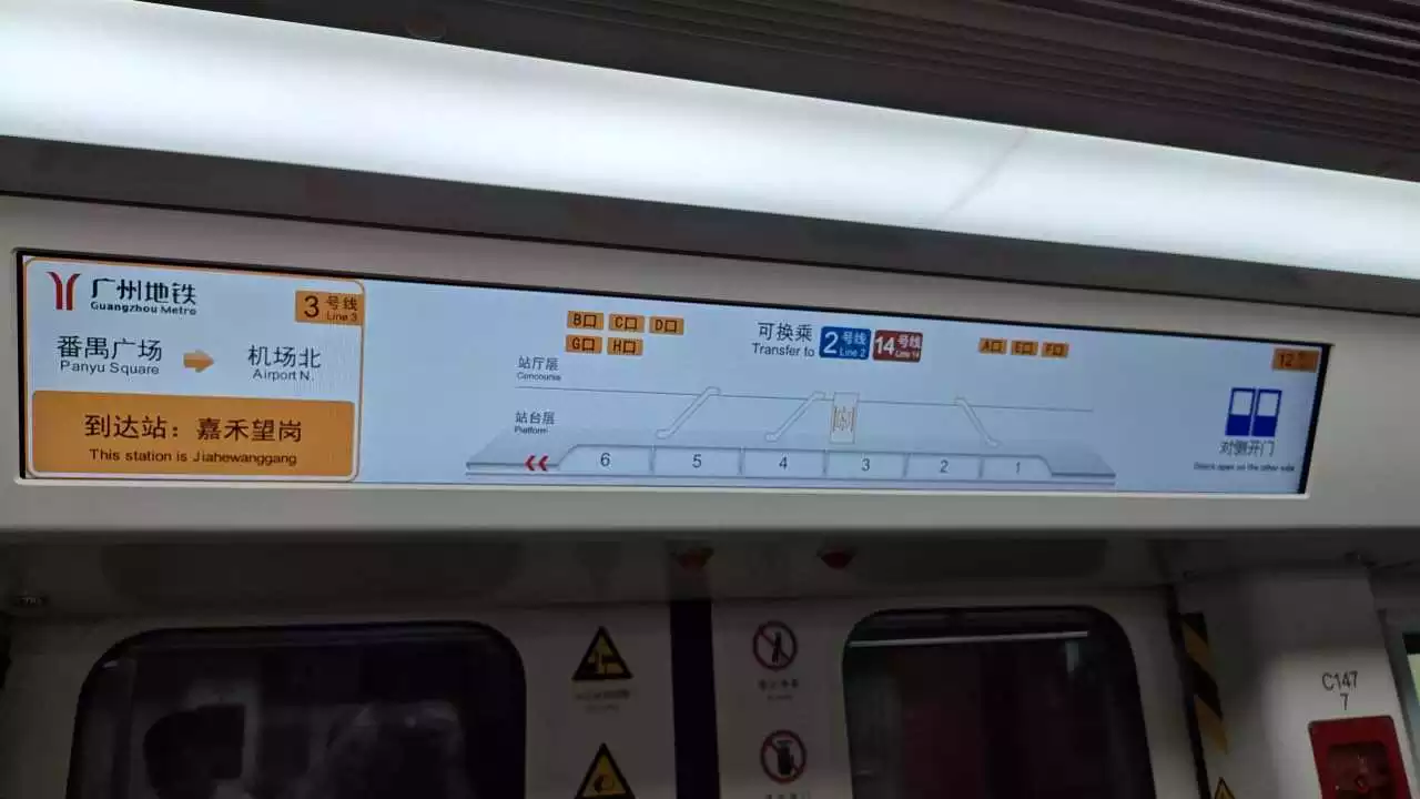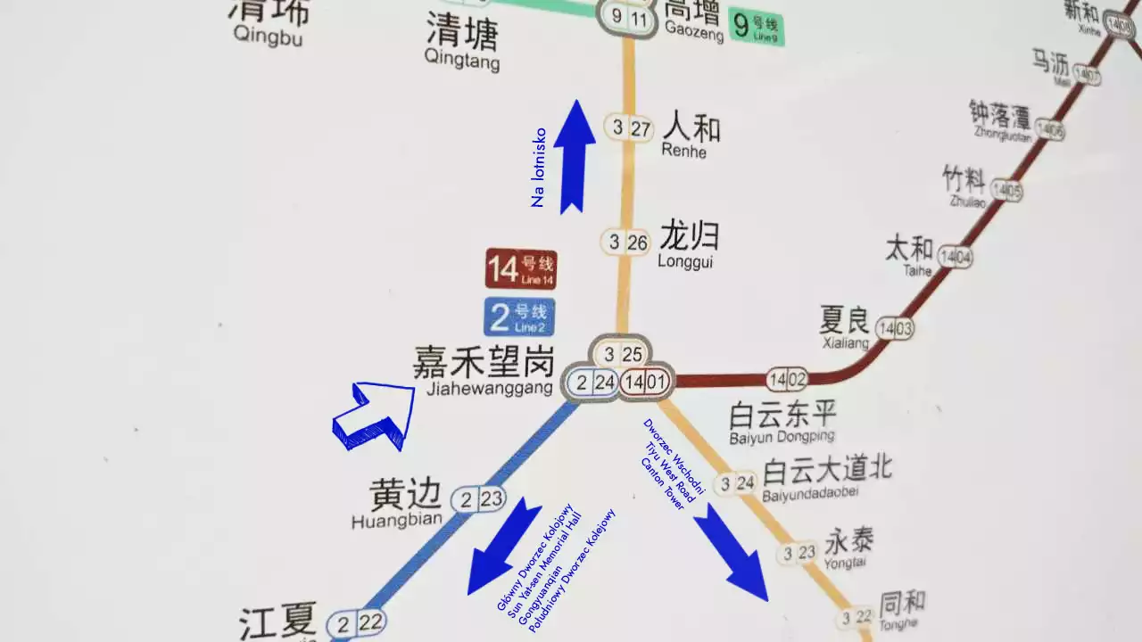 - wariant 2: przejazd pomarańczową linią nr 3 do stacji Jiahewanggang (czwarta stacja na południe od lotniska Baiyun). Przesiadka do pociągu niebieskiej linii nr 2, którym jedziemy do stacji końcowej - Południowego Dworca Kolejowego.