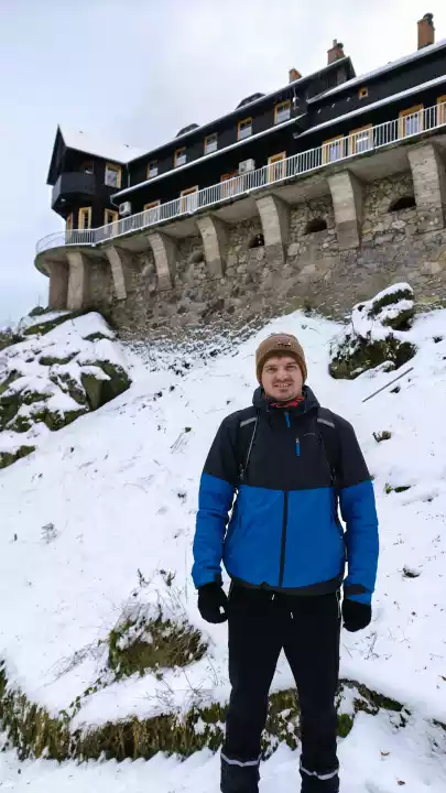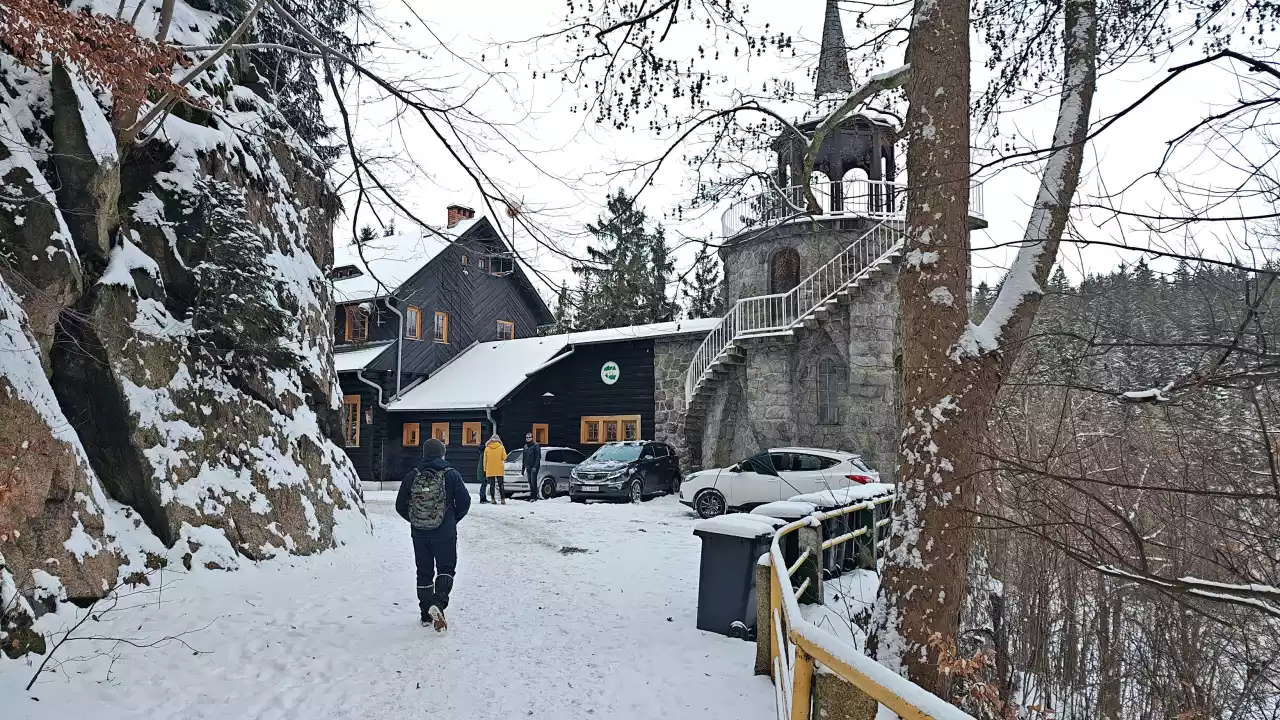 Z każdym krokiem atmosfera stawała się coraz bardziej wyjątkowa, aż w końcu, zza zakrętu, wyłonił się cel naszej wyprawy - charakterystyczna bryła schroniska, niemal nierealnie zawieszona na krawędzi urwiska.